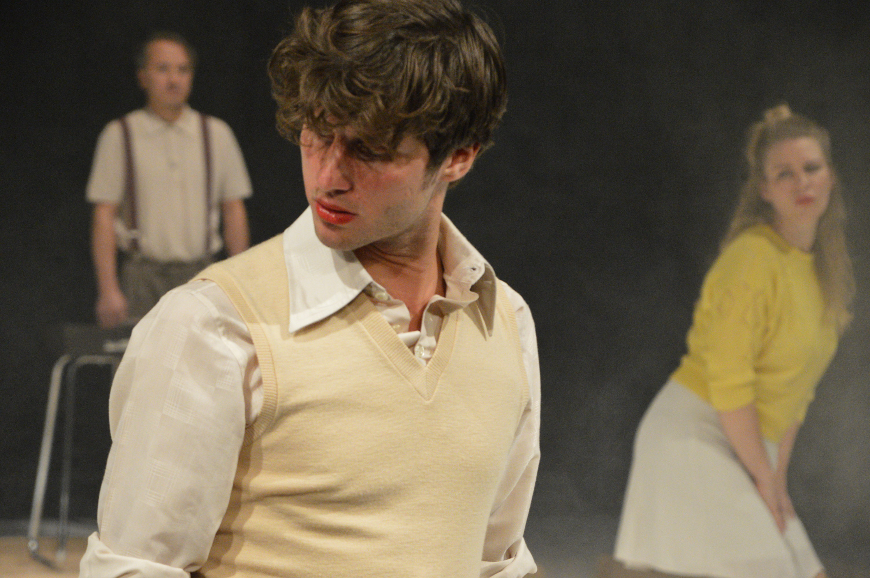Der gesamte theatralen Aufbau reflektiert das Nicht-wahrgenommen-Werden. Selbst die ausgefeilte Choreographie ist von der Topik durchdrungen. Nie stehen die Darsteller*innen vollkommen still. Immerwährend fallen sie sich gegenseitig in ihre Geschichten und erreichen nur dann den Beinahe-gestischen-Stillstand, wenn sie in den eigenen Erinnerungen schwelgen. Die Zeit dazwischen entzieht sich jeglicher Form der Stagnation. M. Bilgeri hüpft so obsessiv über die silikonlastigen Auflagen auf der Bühne wie andere über die immer gleichen Steine eines Kopfsteinpflasters. Verschwinden, verschwinden, immerzu verschwinden, gerne auch im Bühnenbild. A. Jähnert meidet gerade diese Elemente, wenn er mit dem imaginären Rasenmäher manisch lächelnd die Ergebnisse seines Lachkurses präsentiert. Und M. Hemmer