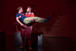 Sind sie aber nicht. Stattdessen werden Schmiedetröge hereingeschoben, tauchen Hände auf oder wird ein neugieriger Drachenkopf durch die Tür gereckt. Was so einfach und Kinderfest-mässig aussieht, erweist sich als sehr robust und äußerst praktikabel. Eine Kulisse, die sich zur überdimensionalen Spielwiese wandelt und dem Ensemble für Rutschpartien und Kletterausflüge zur Verfügung steht (Ausstattung: Agnes Hamvas, Licht: Marcel Busá).