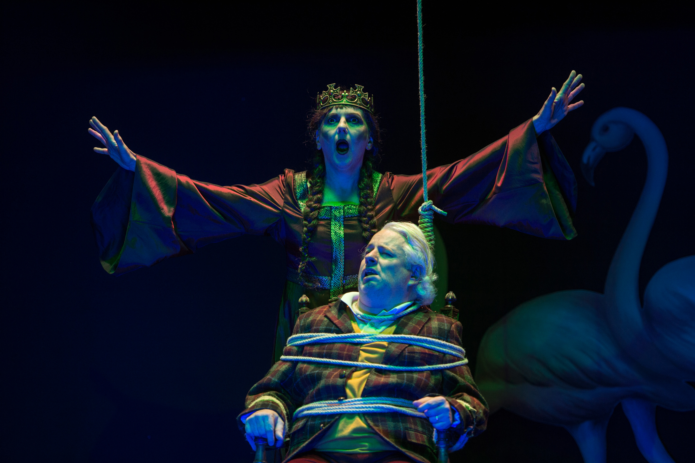 Daniela Enzi ist eine exzellent selbstsüchtige, tief gekränkte und verbitterte Aktrice, die in ihrer großen Rolle als Rächerin ein letztes Mal brillieren möchte. Sie empfängt A. A., wie sie ihn spöttisch tituliert, mit großzügig appliziertem französischen Akzent und einem divergenten Repertoire aus weiblichen Reizen. Dem erliegt der lüsterne Kultur-Narziss ahnungslos und findet sich alsbald an einen Stuhl gefesselt wieder. Es droht ihm Tod durch Erhängen; sehr theatralisch, sehr dramatisch und höchst amüsant. Während Mitzi den Gefesselten mit ihren längst vergangenen Rollen beglückt und ein wunderbares Repertoire an überzogenen Gesten und zweifelhaftem Schauspiel zum Besten gibt, droht A. A. (Antony Connor) gerade durch ihr Schauspiel an den Rand des Wahnsinn getrieben zu werden. In Cordhosen, kariertem Jackett, Pullover und Hemd in kräftige Farben gehüllt, erhält der Kritiker den latent versnobten englischen Landadel-Chic. Köstlich sein mimischer Ausdruck, der zwischen Fassungslosigkeit, Verzweiflung, Wut und Hilflosigkeit oszilliert. Außerdem ist da noch Denis Michaelson (Harald Fröhlich), Mitzis Schauspieler-Gatte, der ebenfalls unter den Verrissen des Star-Kritikers leidet. Trotzdem wirft er sich mächtig für den Gefangenen ins Zeug; was A. A. goutiert, wird von Mitzi boykottiert. Bald