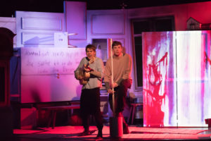 Das märchenhafte Bühnenbild wird durch das musikalische Arrangement intensiviert, selbstverständlich von den Schauspielern*in selbst produziert. Als folkloristische Schweden-Combo schlagen sie in die Eimerbass- (Gregor Schulz), Geigen- (Julienne Pfeil) und Gitarren-Saiten (Gregor Schleuning) und entführen mit magischen Bildern in ein fernes Reich. Wenn Eimerbass und Gitarre unter viel Getöse zu Pferden umfunktioniert werden, scheint das genauso schlüssig, wie die fliegenden Tauben aus Papier. Mit viel Liebe zum Detail lassen Karl (Gregor Schleuning) und Jonathan (Gregor Schulz) sachte ihre Flügel flattern oder raschelt die Mutter (Julienne Pfeil) mit der Zeitung und simuliert das Feuer. Geräusche werden lautmalerisch zum Besten gegeben, ohne dabei ins Kindliche abzudriften.