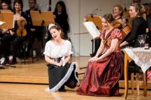 Dafür versammelte sich die Philharmonie Salzburg unter der Leitung von Elisabeth Fuchs auf der Bühne der großen Universitätsaula. Wo anderntags wissenschaftliche Vorträge gehalten oder akademische Titel verliehen werden, hält das bunte Treiben rund um Herrn von Eisenstein Einzug. Übrigens tatsächlich ohne Bühnenbild; als das fungiert das junge Orchester, das pünktlich zum Maskenball fröhliche Kopfbehütungen zückt – da kann es auch schon mal aus dem Publikum „schau Mama, da ist der Obeblix!“ tönen, während der Nachwuchs gen Dirigentin und ihren Wikingerhelm winkt.