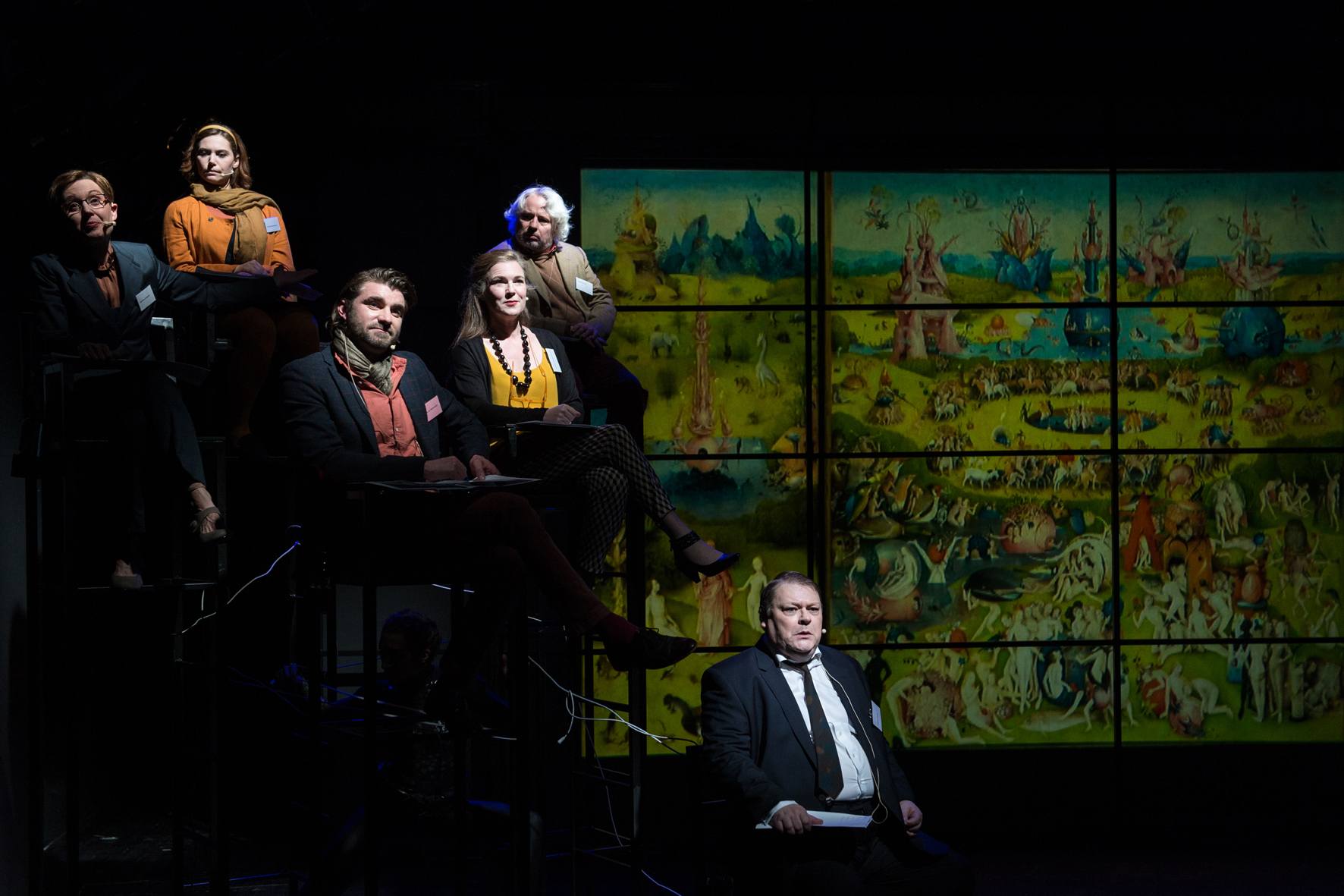 Das Publikum darf während Lucys alkoholbedingtem Ausfall dem herrlich pointierten „Hieronymus Bosch Symposium 2016“ lauschen. Eine Persiflage auf die Kunstgeschichte, so Freundin M. Die muss es wissen, die studiert das Fach. Antony Connor als führender Bosch Experte Professor Richard Schulte hingegen sorgt für ein universitäres Déjà-vu, auch bei der Nicht-Kunsthistorikerinnen-Fraktion. Hieronymus Bosch: U. Arp, K. Kahlert, M. Brunnemann, S. Wende, A. Connor, M. MarotteMit gepresster, leiser Stimme hält er die Einleitung zum Symposium. Wiedererkennungwert? Garantiert. Überhaupt ist die Tagung ein gelungener Schachzug. R. Pienz inszenierte sie als Chorus, der gleichzeitig die verschiedensten Forschungsstimmen zu Hieronymus Boschs „Garten der Lüste“ resümiert. Das versetzt auch die davor nicht informierten Zuschauer*innen spielerisch auf einen analogen Kenntnisstand. Idealerweise fällt sich dabei das Expert*innen-Team (Martin Brunnemann, Antony Connor, Marcus Marotte, Ulrike Arp, Kristina Kahlert) des Öfteren gegenseitig ins Wort oder parliert simultan. Nur Wortfetzen werden hörbar und die verschiedenen bekannten Theorien verklingen harmonisch im großen wissenschaftlichen Ganzen. Zur optischen Untermalung läuft nebenbei eine Videoprojektion von Boschs Meisterwerk. Mit amüsanten Brüchen (Frederic Soltow als hyperaktiver Technik-Verantwortlicher).