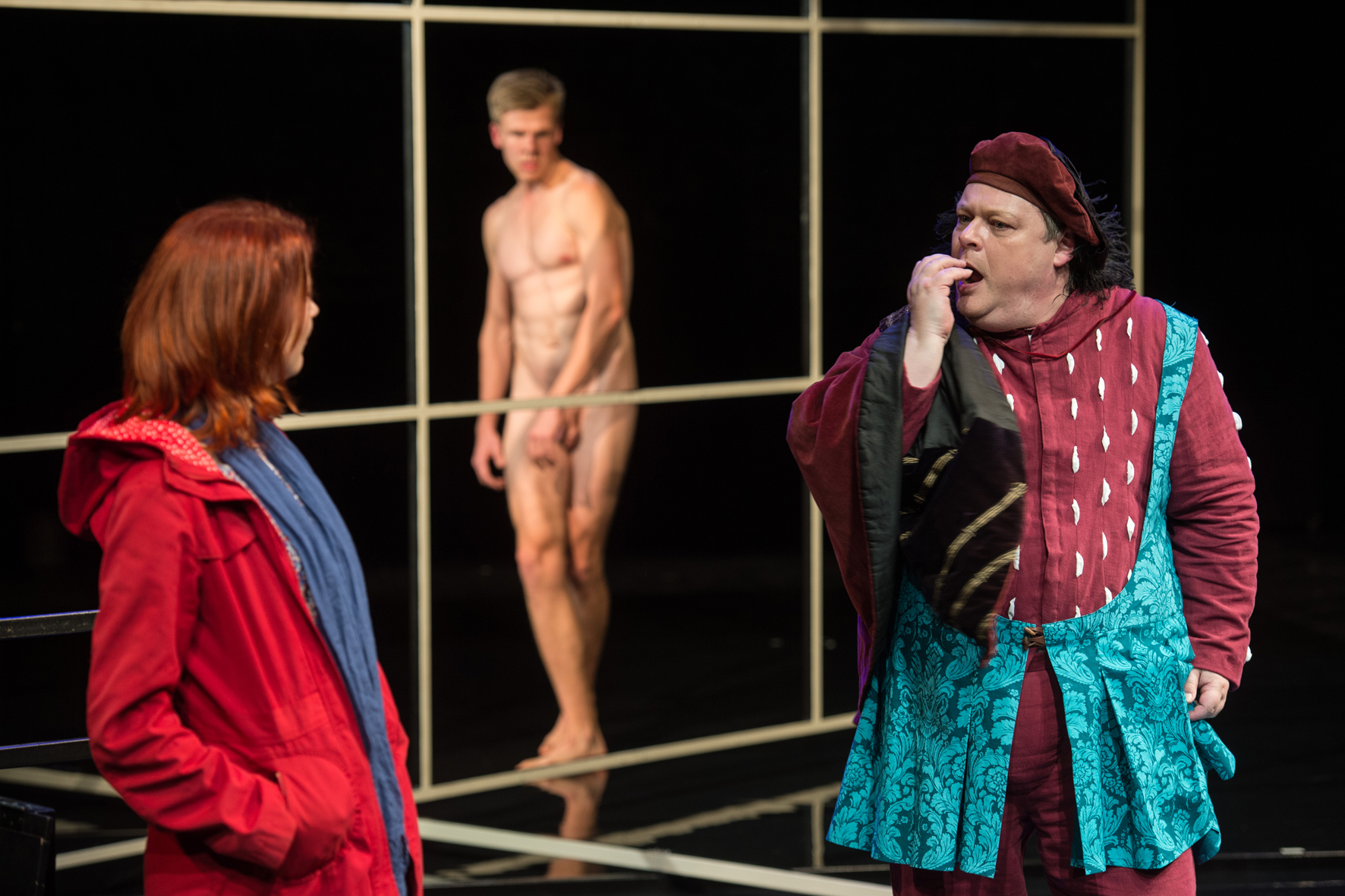 Im dritten szenischen Bild reist Caroline zu Bosch. Natürlich nur im Traum. Psychedelisch, surrealistisch und anders mutet das Aufeinandertreffen der beiden Welten an. Staunend und skeptisch stehen die beiden Mägde Martje (S. Wende) und Anneke (K. Kahlert) aus Boschs Haushalt da. Hieronymus Bosch: C. Thill, F. Soltow, M. MarotteWobei sich Anneke vor allem über die Fremde amüsiert; kindlich begeistert imitiert und bestaunt sie Caroline, während sie von Martje zur Räson gerufen wird. Bevor Caroline aber endlich Hieronymus Bosch (Harald Fröhlich) begegnet, stellt ihr noch ein Adeliger nach (M. Marotte) und will Boschs Frau Aleid van Aken sie abwimmeln (U. Arp). Doch das lässt Caroline nicht zu; die Kunsthistorik-Doktorandin ist nicht umsonst so weit gereist. Endlich kann sie das tun, wovon Wissenschaftler*innen doch insgeheim träumen. Meet and Greet mit dem Großmeister persönlich. Das entpuppt sich aber als relativ unbefriedigend. Kein Wunder, über den Maler ist ja auch fast nichts bekannt. Deshalb dehnen sich die Anspielungen bereits nach kurzer Zeit und gleiten ins Belehrende. Weil ja, natürlich sind alle Äußerungen über die Kunst nur Projektionen anderer. Und dann stoßen sich auch die Mediävistik affinen Germanist*innen am inkohärenten Sprachduktus der scheinbar mittelalterlichen Welt. Das ist allerdings eine persönliche Angelegenheit. Ältere Literatur verpflichtet und so.