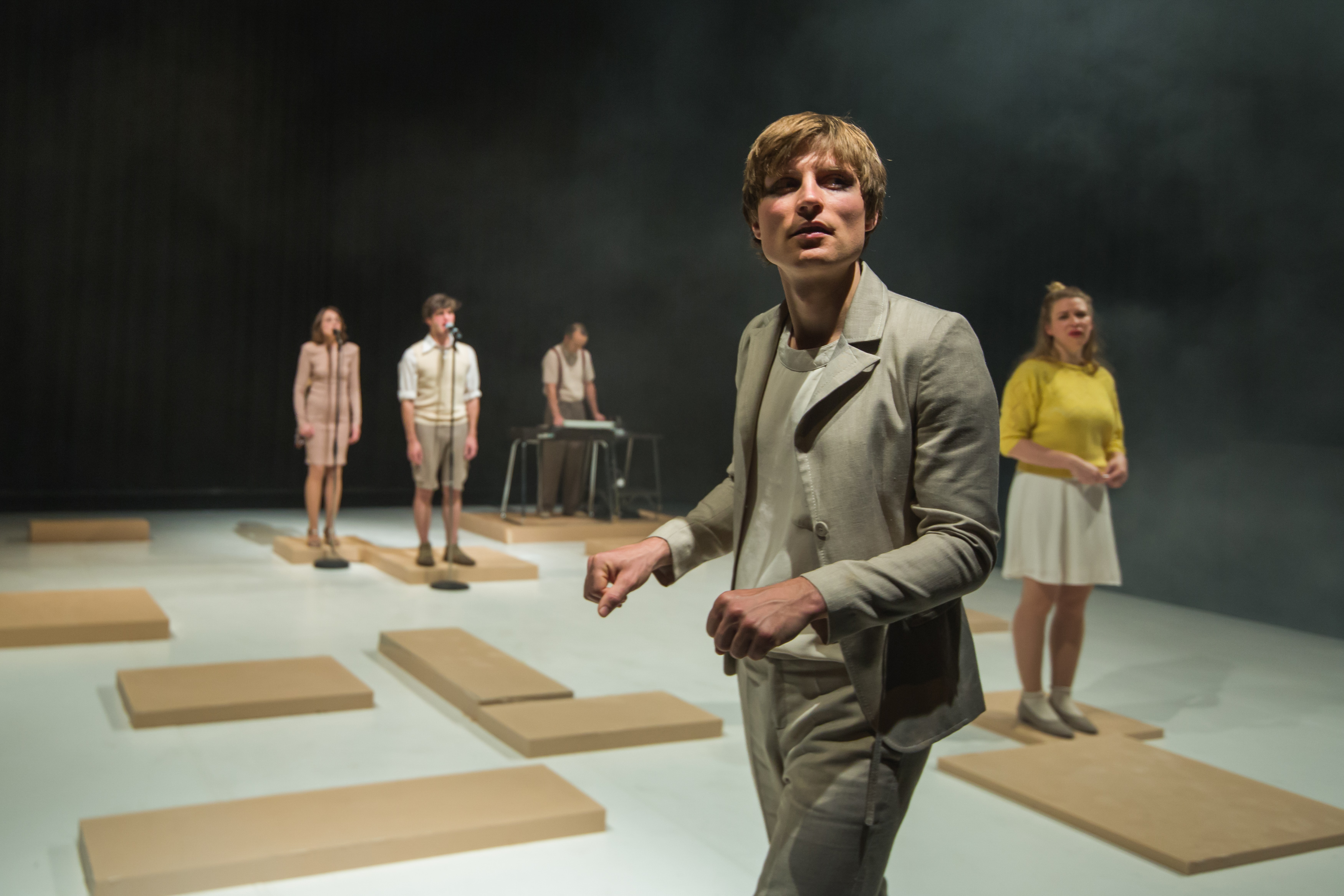 Der gesamte theatralen Aufbau reflektiert das Nicht-wahrgenommen-Werden. Selbst die ausgefeilte Choreographie ist von der Topik durchdrungen. Nie stehen die Darsteller*innen vollkommen still. Immerwährend fallen sie sich gegenseitig in ihre Geschichten und erreichen nur dann den Beinahe-gestischen-Stillstand, wenn sie in den eigenen Erinnerungen schwelgen. Die Zeit dazwischen entzieht sich jeglicher Form der Stagnation. M. Bilgeri hüpft so obsessiv über die silikonlastigen Auflagen auf der Bühne wie andere über die immer gleichen Steine eines Kopfsteinpflasters. Verschwinden, verschwinden, immerzu verschwinden, gerne auch im Bühnenbild. A. Jähnert meidet gerade diese Elemente, wenn er mit dem imaginären Rasenmäher manisch lächelnd die Ergebnisse seines Lachkurses präsentiert. Und M. Hemmer Immersion. Wir verschwinden. / Martin Hemmer & Ensemblewindet sich lasziv zu seinem Song. Apropos! Selbst S. Romei mit ihrer Ukulele steht nie still. Wunderbar die musikalischen, sphärischen  Einlagen – eigentlich wäre so ein Aktionstheater Ensemble-Album eine wunderbare Idee; die schrägen Töne, die an Kurt Weill erinnern, buhlen geradezu um Aufmerksamkeit und verfügen über beachtliches Ohrwurm-Potential. Als absoluter Fels in der Brandung etabliert sich K. Musser; der Musiker steigert den Stillstand ins Exorbitante und löst sich geradezu im viel beschworenen Nichts auf.