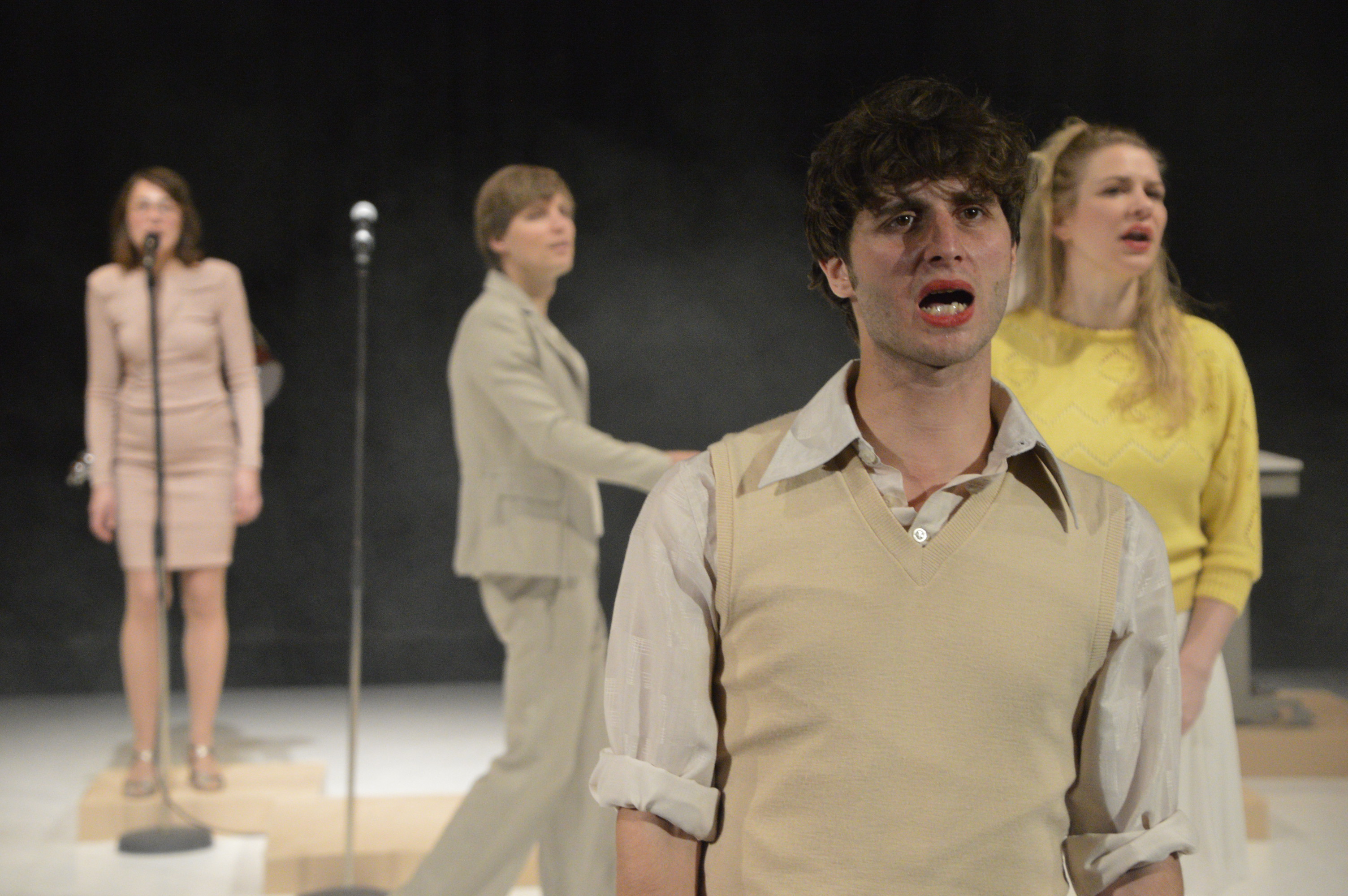 Auf der Bühne stehen drei Schauspieler*innen (Michaela Bilgeri, Martin Hemmer, Andreas Jähnert) und zwei Musiker*innen (Sonja Romei, Kristian Musser). Die einen beginnen zu erzählen. Selbstironisch berichtet sie (M. Bilgeri) mit gekränktem Stolz von den Erfolgen einer Werbespot-Protagonistin. Anfangs dezent und spöttisch, später immer emotionaler. Auf die Emotionalität folgen die großen Gesten. Gleichzeitig wird Michaela nicht müde, auf ihre eigene Auszeichnung als Gewinnerin des Vorarlberger Kulturpreises zu verweisen. Mit den Fingern schnippend erzwingt sie die leicht ablenkbare Aufmerksamkeit ihrer männlichen Kollegen. Die ergehen sich derweil nämlich eigentlich viel lieber in ihren eigenen „Heldentaten“. Immersion. Wir verschwinden. / Andreas Jaehnert und EnsembleAndreas (A. Jähnert) berichtet davon, wie er als Poesie verfassender Ehrengast bei der Hochzeit von Freunden in einem Tiroler Sterne-Hotel untergebracht war. Das erhabene Gefühl, das er empfand, als er gemeinsam mit dem Brautpaar alle anderen Gäste aus den nichtssagenden, umliegenden Unterkünften einsammelte, beschreibt er ausführlich und genießt die kleine Retrospektive sichtlich. Kurz darauf allerdings verblasst der anfängliche Ruhm und macht dem gekränkten Dichter-Stolz Platz. Nichts da mit dem Petrarcaschen Lorbeerkranz für den brillantesten Lyrik-Vortrag während der Feierlichkeiten auf der Finanzmogulen-Sause. Stattdessen listet Andreas im immer zorniger werdenden Tonfall alle damals anwesenden Prominenten auf, die er dem Publikum mit großartiger Leichtigkeit entgegenwirft. Michaela kennt keinen. Halt, nein, Veronica Ferres, die ist ihr ein Begriff. Und Angela Merkel auch. Die wurden aber auch in der „Bunten“ erwähnt, wie Andreas säuerlich hinzufügt. Martin (M. Hemmer) indes versucht mit seinen Erlebnissen auf einem nepalesischen Berggipfel zu glänzen. Vom anfänglichen Star der Filmproduktion reduziert sich seine Rolle allerdings rasch zu der eines Statisten und dann noch eines australischen! Dafür darf er auf die Bühne pinkeln. Die Frage, ob er das jetzt wirklich gemacht hat, bleibt bis zum Ende offen. (Und dann entscheiden wir, ja, wir trauen das dem Aktionstheater Ensemble durchaus zu).